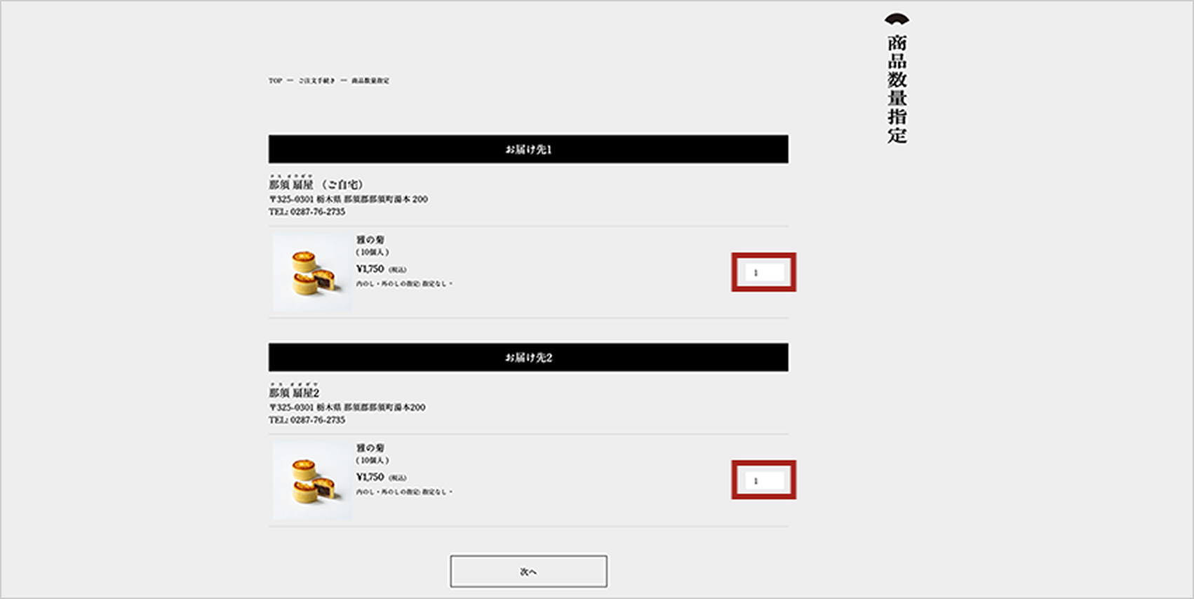 ※お届先毎で、商品数量が異なる場合は、「商品数量指定」にて変更できます。