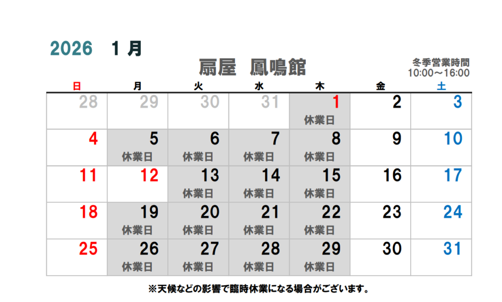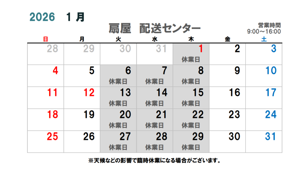 誠に恐れ入りますが、1月は下記の期間を休業日とさせていただきます。ご迷惑をおかけしますが何卒よろしくお願いいたします。